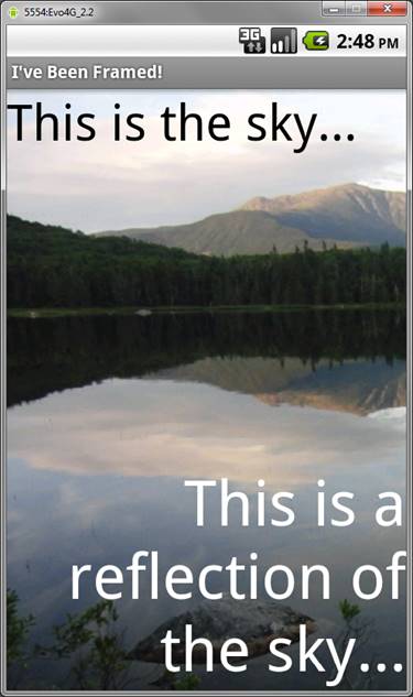 <?xml version="1.0" encoding="utf-8"?> <FrameLayout xmlns:android="http://schemas.android.com/apk/res/android" android:layout_width="fill_parent" android:layout_height="fill_parent"> <ImageView android:id="@+id/ImageView01" android:layout_height="fill_parent" android:layout_width="fill_parent" android:src="@drawable/lake" android:scaleType="matrix"></ImageView> <TextView android:layout_width="fill_parent" android:layout_height="wrap_content" android:textColor="#000" android:textSize="40dp" android:text="@string/top_text" /> <TextView android:layout_width="fill_parent" android:layout_height="wrap_content" android:text="@string/bottom_text" android:layout_gravity="bottom" android:gravity="right" android:textColor="#fff" android:textSize="50dp" /> </FrameLayout> |