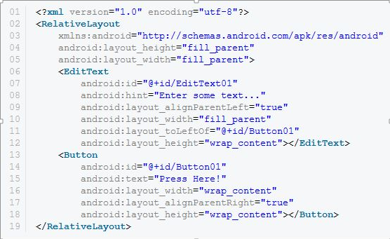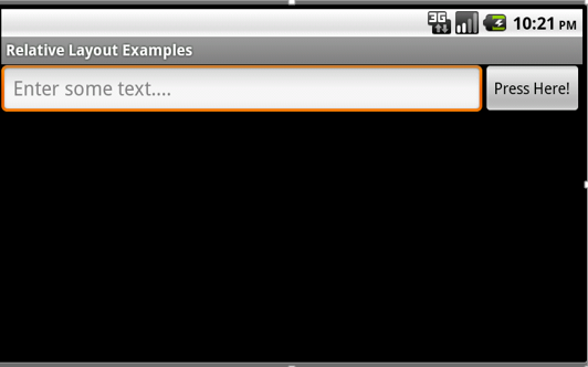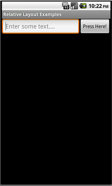 layout را می توان به خوبی با یک مثال توضیح داد. ما می خواهیم یک صفحه با یک کنترل EditText و یک کنترل button طراحی کنیم، که Button در سمت راست EditText نمایش داده شود. بنابراین ما باید relative layout با دو کنترل فرزند تعریف کنیم: EditText و Button . کنترل EditText قانونی دارد که می گوید: این کنترل را در سمت چپ کنترل والد(layout) تنظیم کن و در سمت چپ کنترل دوم،(button) قرار بده. ضمنا، کنترل button هم قانونی دارد که می گوید: این کنترل را در سمت راست کنترل والد (layout) تنظیم کن. شکل ذیل فقط یک relative layout را نشان می دهد. این relative layout دارای دوکنترل فرزند: edittext و button می باشد.تعریف یک XML Layout Resource با یک Relative Layout