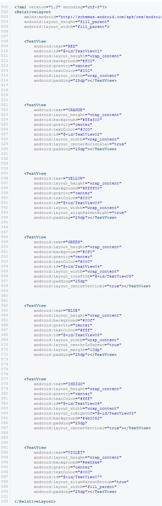 سپس ما تعیین میکنیم که چه کنترل های فرزندی داشته باشیم.در این مورد ما هفت تا کنترل TextViewنیاز داریم (برای هر رنگ یک کنترل).آن ها را تنطیم کنید همان طور که معمولا این کار را انجام می دهید،تبدیل کردن خصوصیات متن به رشته، رنگ های پیش زمینه،اندازه ی حروف و ... . هر یک از این کنترل ها را در داخل relative layout خود قرار دهید.مرحله ی سوم: نقش های relative layout را تعیین کنید.