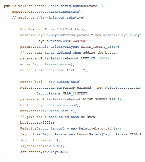 شما می توانید از طریق برنامه نویسی نیز relative layout را ایجاد و پیکربندی کنید. این کار با استفاده از کلاس relative layout انجام می¬شود. (android.widget.Relative) شما می توانید پارامترهای خاص را کلاس RelativeLayout.LayoutParams پیدا کنید، هم چنین پارامترهای معمولی (android.view.ViewGroup.LayoutParams) مانند layout_height و layout_width و پارامترهای حاشیه (ViewGroup.MarginLayoutParams) ، به اشیا relative layout اعمال می¬شود. به جای اینکه یک layout resource به طور مستقیم بارگذاری شود، همان طور که قبلا نشان داده شده از متد setContentView() استفاده می شود. شما باید به جای ساختن محتوای اسکرین در جاوا و سپس تولید یک شیء layout والد که شامل همه¬ی محتویات کنترل برای نمایش view های فرزند،در متد setContentView() استفاده می¬شود. در این حالت، layout والد شما، relative layout خواهد بود. به عنوان مثال، کد زیر نشان می دهد که چگونه با برنامه نویسی یک نمونه Activity یک relative layout داشته باشیم و یک Textview و یک کنترل button در آن با متد onCreate() قرار دهیم. همانند چیزی که در قسمت قبل نشان داده شده بود:حال بیاید نگاه دقیق تری به کد لیست جاوا بیندازیم. اول یک EditText به صورت نرمال ایجاد می کنیم. ما ان را به بعضی پارامترهای relative layout می دهیم و سپس قوانین آنها را تنظیم می کنیم. در این مورد، ما دو قانون برای کنترل EditText ایجاد می¬کنیم. سپس، ما یک کنترل button ایجاد کرده و قوانین آن را تنظیم می کنیم.(قرار گرفتن در سمت راست layout والد). در نهایت، یک شیء relative layout ایجاد می کنیم، پارامترای آن را set می کنیم، با استفاده از متد addView() دو تا کنترل فرزند را به آن add می کنیم و با استفاده از متد setContentView() ، relative layout را برای صفحه نمایش بارگذاری می¬کنیم. همان طور که می بینید،هرچقدر که کنترل ها به صفحه اضافه می شوند،کد می تواند از نظر اندازه به سرعت رشد کند.برای سازماندهی و قابلیت تعمیر وجداسازی،تعریف و استفاده از layout ها به صورت برنامه نویسی در حالت های فردی و تکی بهتر از حالت های وسط و معادل است. حال بیایم اندکی در مورد صفاتی که به تنظیم یک relative layout و کنترل های فرزند آن کمک می کنند، بحث کنیم. برخی از ویژگی های خاص که به relative layout- به عبارت دیگر قوانین فرزند- اعمال می شود عبارتند از :