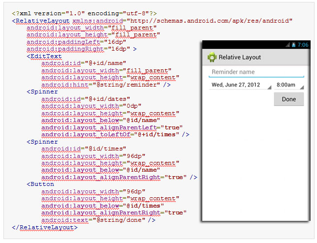 یک Relative Layout یک ابزار بسیار قدرتمند برای طراحی یک رابط کاربر است زیرا توانایی از بین بردن گروه نماهای تودرتو را دارد و سلسله مراتب Layout را به صورت مسطح حفظ کند، که باعث بهبود عملکرد می شود. اگر شما بخواهید در کارتان از چند گروه Linear layout تودرتو استفاده کنید، ممکن است بتوانید آنها را تنها با یک Relative Layout جایگزین کنید.